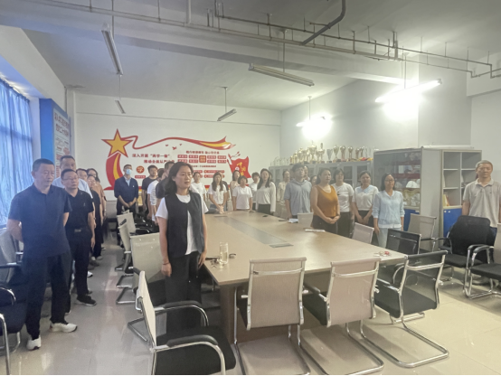 上午9时整,大会正式开始,全体肃立,在雄壮激昂的国歌声中,国旗护卫队官兵护卫的五星红旗冉冉升起。学院全体教职工自发地全体肃立,齐声高唱国歌,“起来!不愿做奴隶的人们!……”激昂熟悉的旋律在会议室回荡,歌声嘹亮,情感真挚。这一自发举动,展现了老师们深厚的家国情怀和崇高的民族自豪感,用最直接的方式表达了他们对祖国的无限热爱与忠诚。