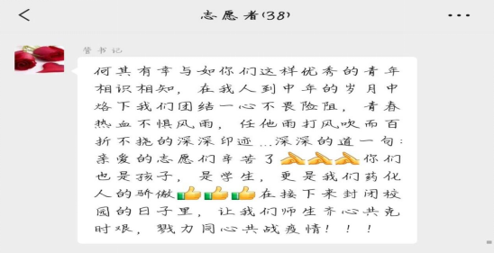 面对突如其来的疫情,学校非常重视这次疫情防控工作,不仅有韩书记给同学们的谆谆寄语,还为全校学生致来一封信,信中字字千钧,给予了同学们充分的安全和温暖,无不让为之动容。药化学院领导与辅导员也身先士卒,充分发挥带头引领作用,坚守工作岗位,陪伴在学生身边,与学生共患难。时刻关注学生学习生活以及健康心理,提醒学生注意养成良好的个人卫生习惯,勤洗手,出门佩戴口罩,做好每天消杀记录,保证学生生活环境的安全整洁,向学生宣传抗疫精神,引导学生配合学校防疫工作。相信,只要大家每个人做好个人防护,每个人都是抗疫的一员,并坚信疫情终将过去。