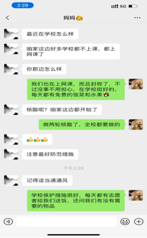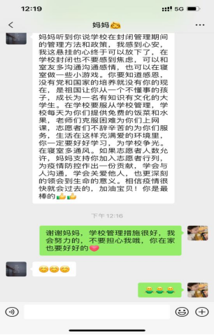 环境19的曲宇婷的家长在和自己孩子视频通话的过程中了解到学校的老师为避免学生在封校的情况下产生焦虑心理,为学生们提供了24小时线上心理健康教育咨询,他对学校的做法表示非常认可,感谢学校在疫情防控工作繁重的时刻还能想到孩子的心理健康问题,不仅从物质上保障孩子的生活,并且从精神上帮助学生缓解心理压力。