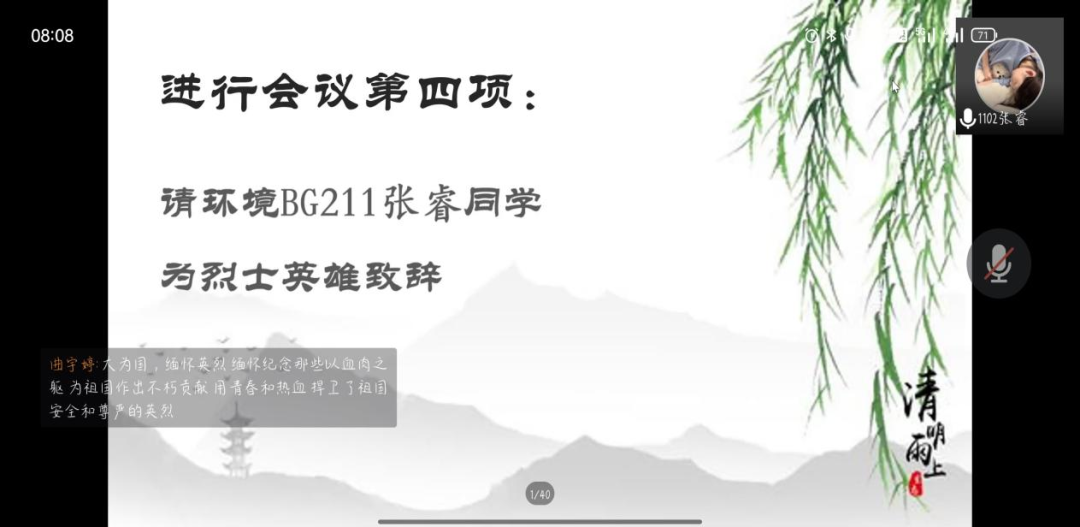 最后,主持人艾师旭宣布进行大会最后一项请同学们打开摄像头集体合影,对本次线上祭祀活动进行总结。作为新时代大学生,需要我们用英烈精神来激发斗志、鼓舞干劲,把爱国情、强国志、报国行自觉融入到学习和生活中,循着英雄的足迹走下去,承着英雄的事业干下去,以改革发展的新业绩、励精图治的新风貌告慰先烈英灵。