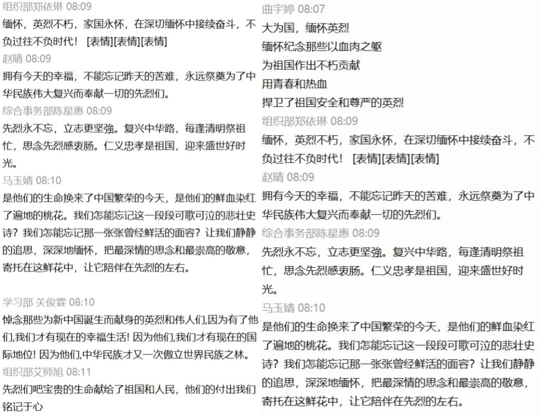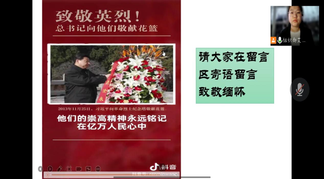 上午8:00,主持人艾师旭宣布本次线上清明祭扫活动开始。由艾师旭带领大家在线上进行祭祀,同学们通过登录网址点击祭奠英烈浏览先人生前感人事迹,然后通过点击敬献花篮,向先人敬献鲜花,向英烈鞠躬,发表寄语进行留言。并全体向先人默哀一分钟以表达缅怀之情。