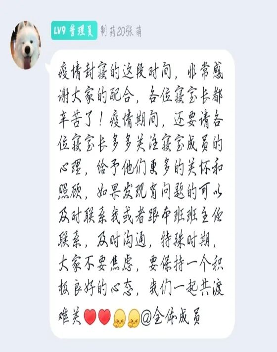 辅导员果巾迪、全凤兰两位老师在同药化学院宿舍学生楼长开会时强调,要多关注校园封控管理期间同学们的心理健康,积极为有需要的同学进行心理疏导,引导同学正确认识疫情,缓解疫情带来的压力。要克服“蜻蜓点水”式的工作方式,力求精准到位。在生活方面,要时常关心学生,并主动为同学们购买生活所需物品,增加人文关怀。各学生楼长在传达会议精神时,希望各寝室长能够担起职责,时刻关注寝室成员的状态。寝室长与同学朝夕相处,更易察觉寝室成员的心理变化,如有发现寝室同学有疫情焦虑、烦躁、学业课业迷茫、灰心丧气等消极负面情绪,要及时对寝室成员进行谈心,并打消寝室成员的负面情绪;当有困难的同学发现问题且无法解决时,及时与班主任进行沟通处理。