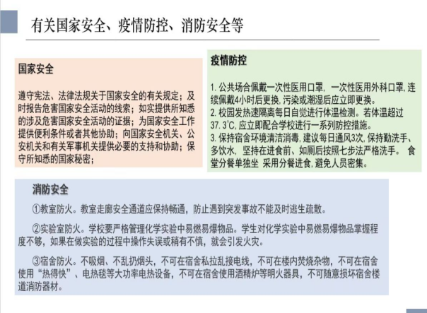 新生入学教育持续10天,开展多个专题活动,内容生动丰富。新生入学教育是新生启航工程重要组成部分,通过系统学习,可以从各个方面让新生快速了解大学期间必知、应知内容,更好地适应大学生活。8月26日—9月2日,药化学院精心组织“云端”见面会暨安全教育第一课,带领新生学习疫情防控、防诈骗、防传销知识,通过分享案例来增强学生的安全观念,提高学生校园安全意识,明确校园不安全的行为,防止校园诈骗,增强自我保护能力,构建起家校沟通的桥梁,帮助学生树立正确的安全观,维护校园安全稳定。