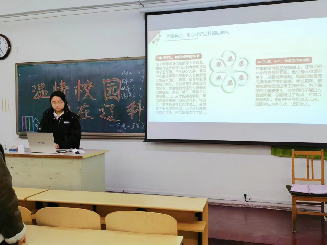 此次团课活动中,各专业团支书从不同角度出发,以校园干净整洁的生活学习环境展开,用内容丰富的ppt形式为大家详细讲解,通过列举疫情期间在老师带领下,学生党员和干部们攻坚克难;学生们清扫实验室、图书馆保障大家的安全和学习环境等例子向大家讲述了校园里的暖心故事,让同学们了解校园各处的温情与浪漫,随后让大家叙述发生在身边的温暖时刻,号召同学们携手共创美好校园。此次团课内容令同学们深刻理解互帮互助含义,激发了广大学子对校园的自豪感、认同感和归属感,增强了大家爱校荣校的意识。
