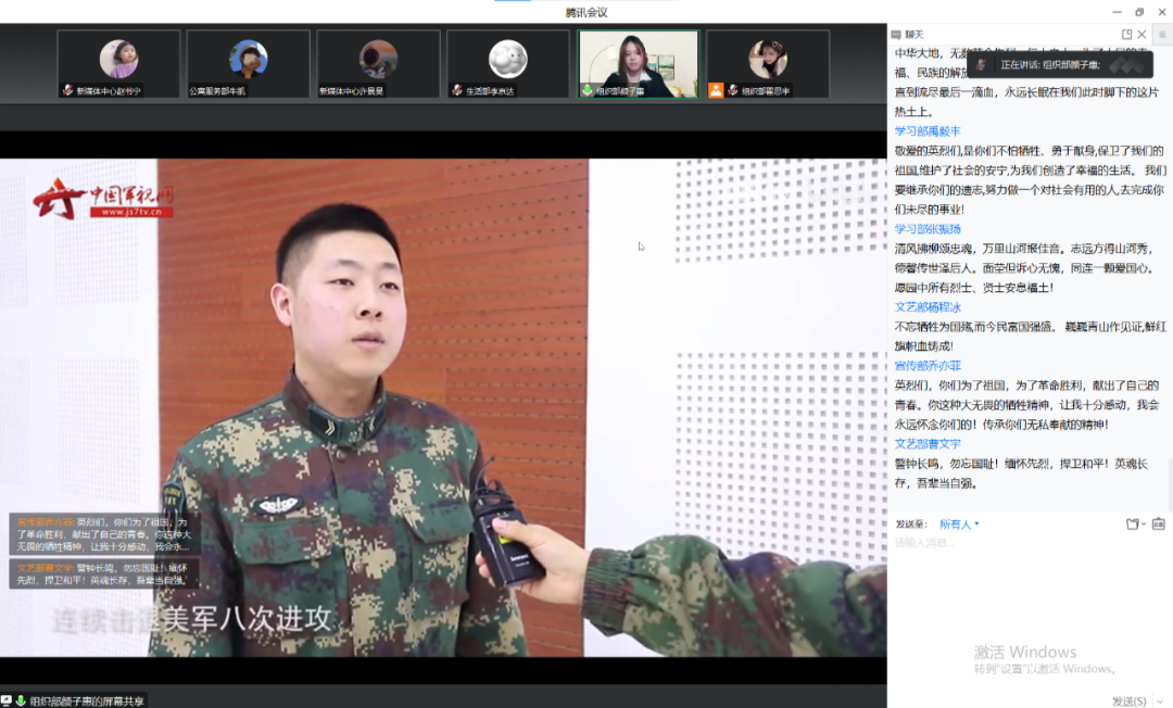 活动第二项,全体同学共同观看为祖国的解放事业而献身的英烈事迹,同学们无不被英烈们高尚的道德品质、坚贞的民族气节和伟大的献身精神所感动,纷纷在留言区寄语留言,向英烈致敬,缅怀先烈。活动第三项,全体同学向英烈默哀三分钟,向牺牲英烈表达深切哀悼。