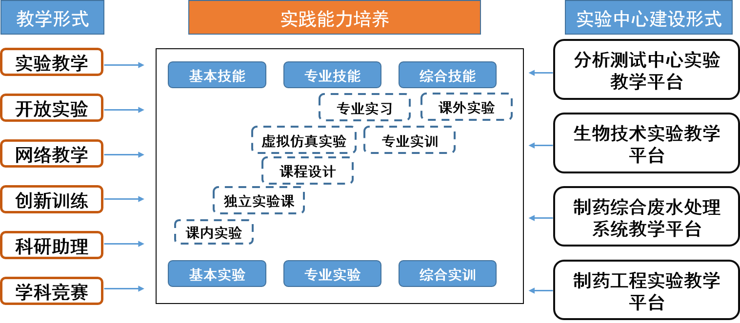 围绕“高等学校实验教学示范中心建设标准”,分层次建立教学、专业实践能力培养、科研实验室,配置先进的大型仪器设备。建设一流教学环境。进一步改革应用化学、制药工程、环境工程和生物技术等专业的课程体系,依托化学工程与技术学科的发展、改革教学内容、改进教学手段和教学方法,注重学生创新能力培养;实行开放式实验教学,营造不同层次的有利于个性发展的实验环境。改革课程教学管理体制和组织形式,建立一支结构合理、责任心强、不断进取和充满活力的师资队伍和实验室人员队伍,保证示范中心可持续发展,为培养高素质人才服务。